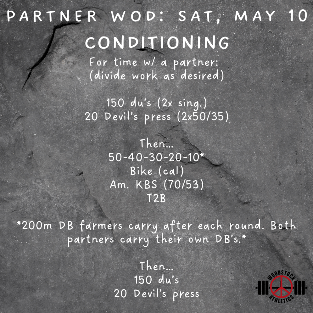 Partner WOD & Barbell Club: Sat, May 10 Posted bySteph VermeychukMay 10, 2025May 4, 2025Posted inWorkout of the Day Share this: Click to share on X (Opens in new window) X Click to share on Facebook (Opens in new window) Facebook Like Loading... Related