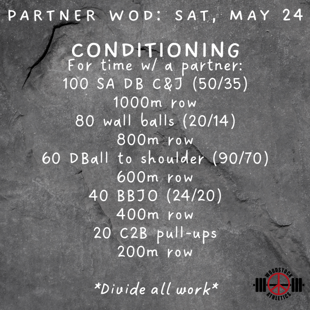 Partner WOD & Barbell Club: Sat, May 24 Posted bySteph VermeychukMay 24, 2025May 18, 2025Posted inWorkout of the Day Share this: Click to share on X (Opens in new window) X Click to share on Facebook (Opens in new window) Facebook Like Loading... Related