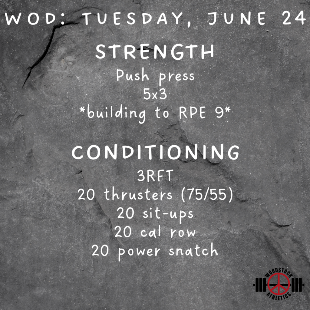 WOD & Barbell Club: Tuesday, June 24 Posted bySteph VermeychukJune 24, 2025June 22, 2025Posted inWorkout of the Day Share this: Click to share on X (Opens in new window) X Click to share on Facebook (Opens in new window) Facebook Like Loading... Related