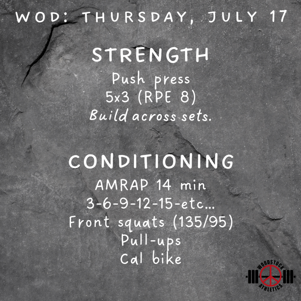 WOD & Barbell Club: Thursday, July 17 Posted bySteph VermeychukJuly 17, 2025July 16, 2025Posted inWorkout of the Day Share this: Click to share on X (Opens in new window) X Click to share on Facebook (Opens in new window) Facebook Like Loading... Related