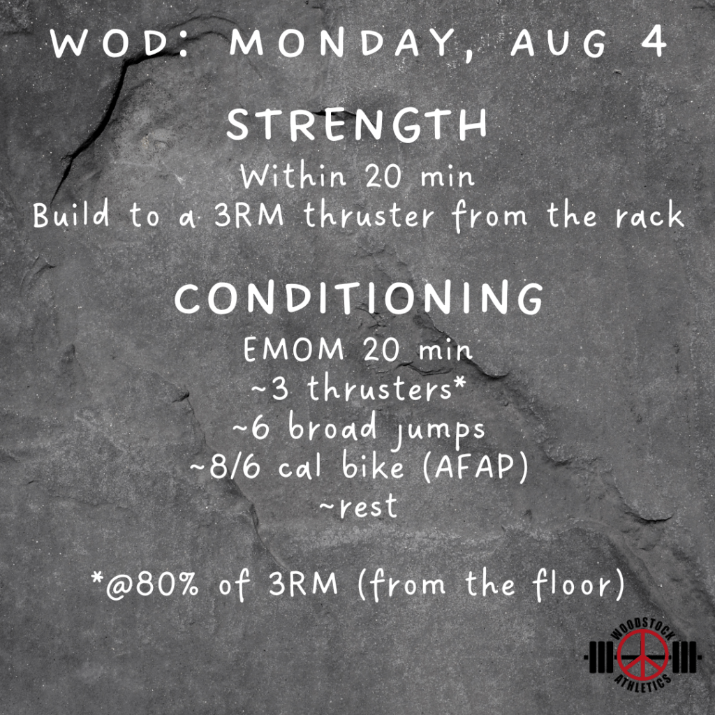 WOD: Monday, August 4 Posted bySteph VermeychukAugust 4, 2025August 3, 2025Posted inWorkout of the Day Share this: Click to share on X (Opens in new window) X Click to share on Facebook (Opens in new window) Facebook Like Loading... Related