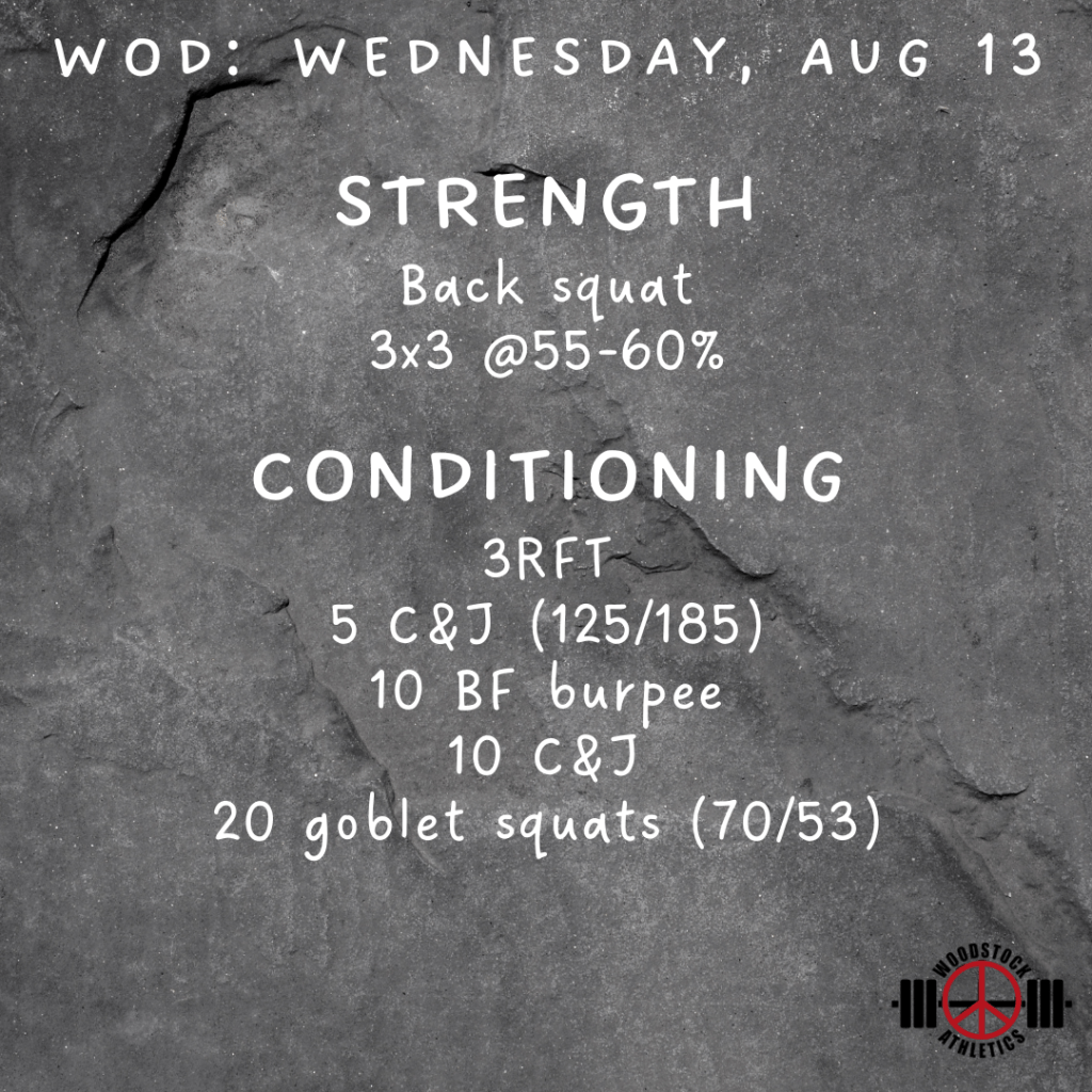 WOD: Wednesday, August 13 Posted bySteph VermeychukAugust 13, 2025August 10, 2025Posted inWorkout of the Day Share this: Click to share on X (Opens in new window) X Click to share on Facebook (Opens in new window) Facebook Like Loading... Related