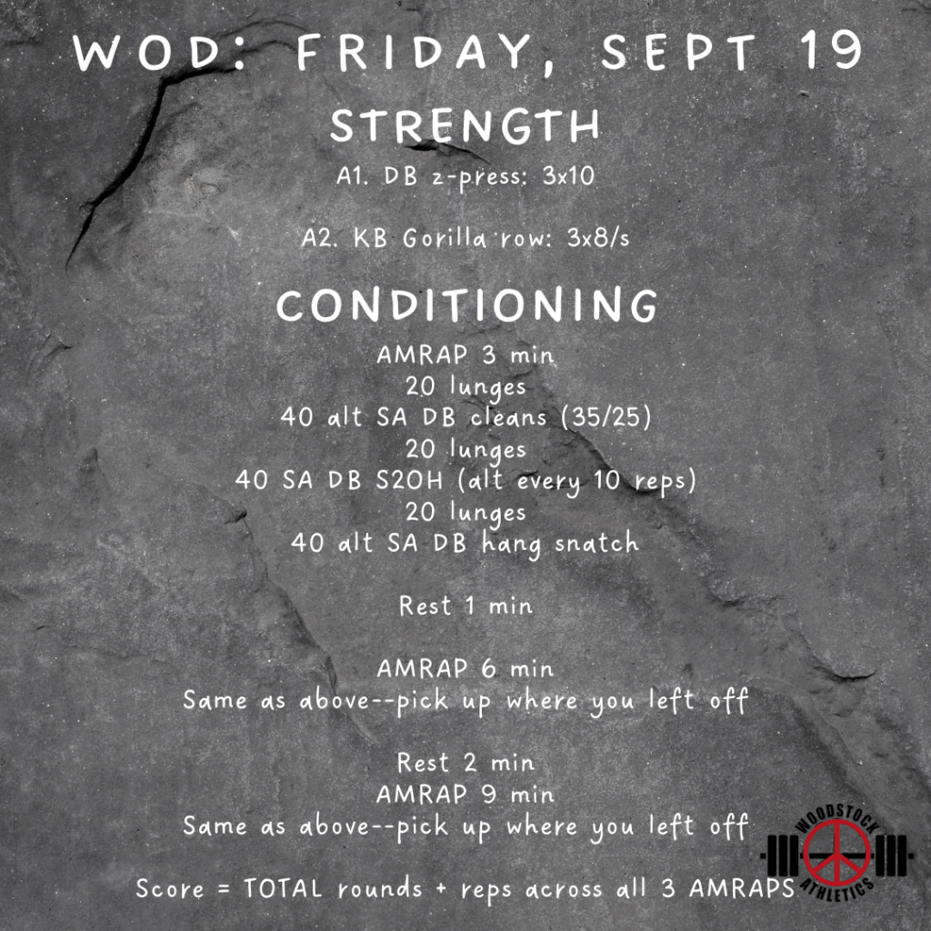 WOD: Friday, September 19 Posted bySteph VermeychukSeptember 19, 2025September 13, 2025Posted inWorkout of the Day Share this: Click to share on X (Opens in new window) X Click to share on Facebook (Opens in new window) Facebook Like Loading... Related