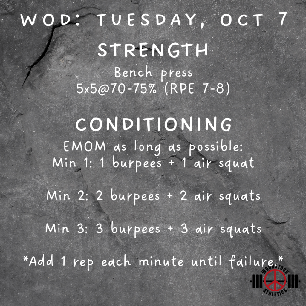 WOD: Tuesday, October 7 Posted bySteph VermeychukOctober 7, 2025October 3, 2025Posted inWorkout of the Day Share this: Click to share on X (Opens in new window) X Click to share on Facebook (Opens in new window) Facebook Like Loading... Related