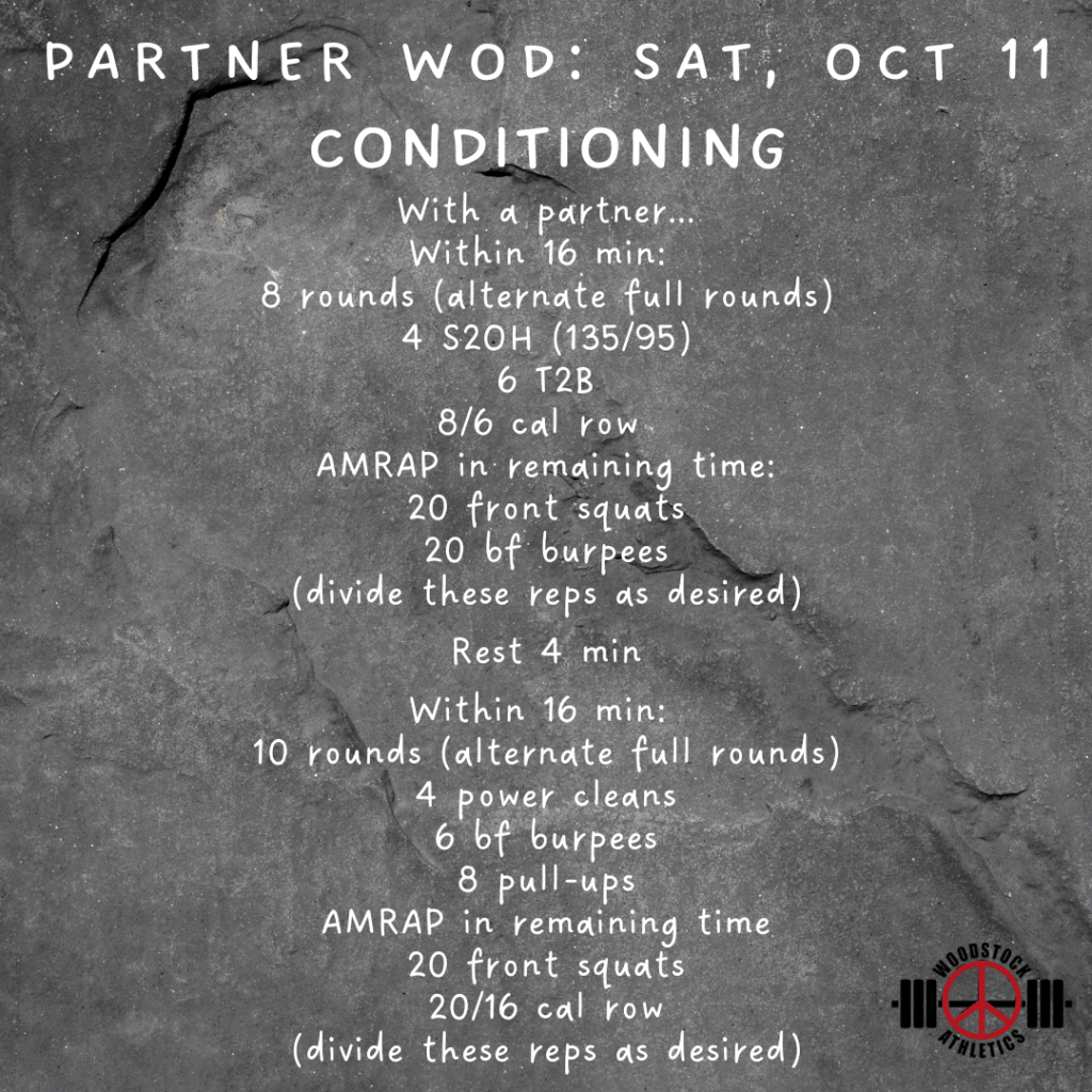 Partner WOD: Saturday, October 11 Posted bySteph VermeychukOctober 11, 2025October 3, 2025Posted inWorkout of the Day Share this: Click to share on X (Opens in new window) X Click to share on Facebook (Opens in new window) Facebook Like Loading... Related