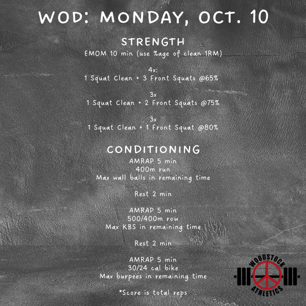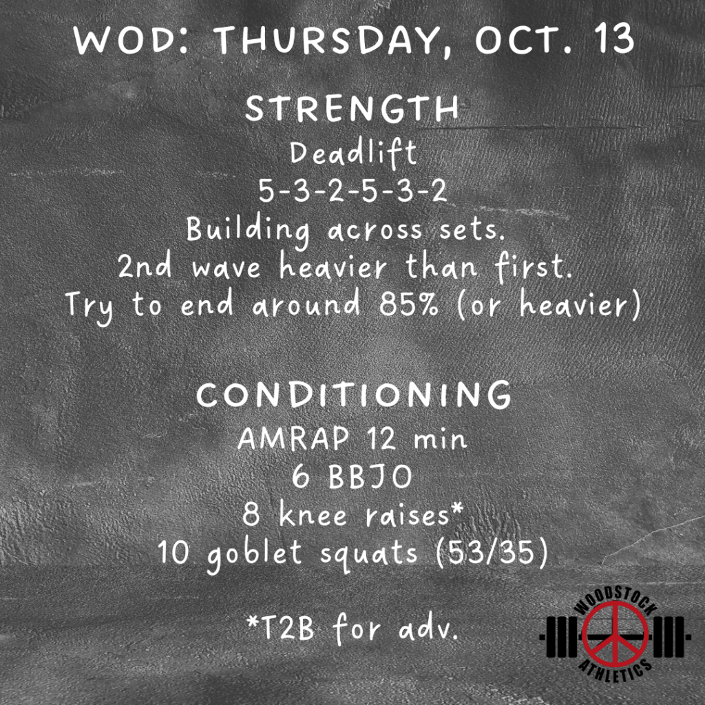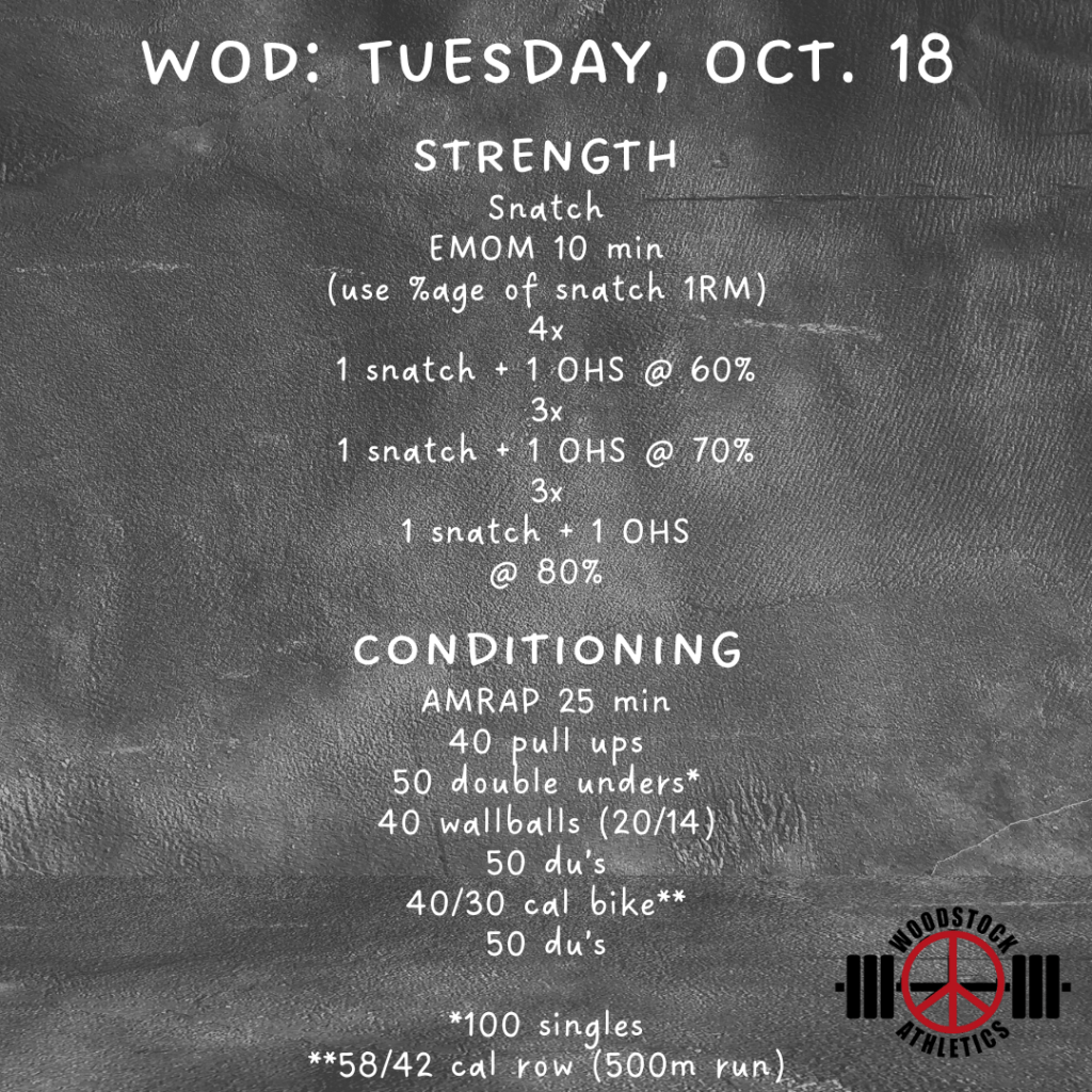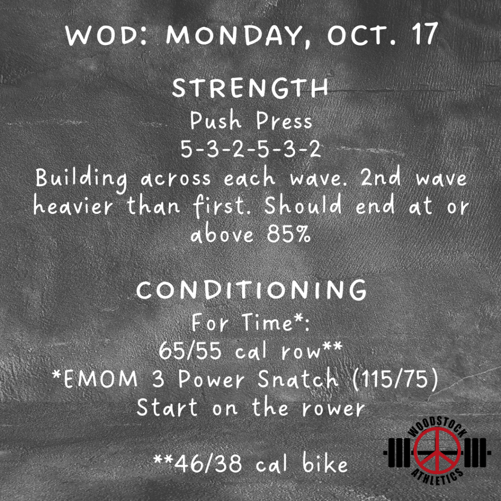 Hey hey everyone! We have entered the next phase of our current programming cycle. For our strength training, we’re going to drop the volume a bit and increase the intensity. This means we’ll be doing fewer reps at higher percentages. For those of you who don’t know or don’t have current 1RM’s on your lifts, ask your coach what a certain percentage should feel like. As a general rule, multiple reps anything over about 80% of a true 1RM should feel challenging but doable. But you should feel like you need to take a second and mentally prepare to approach the bar. Let’s have a great week!!!