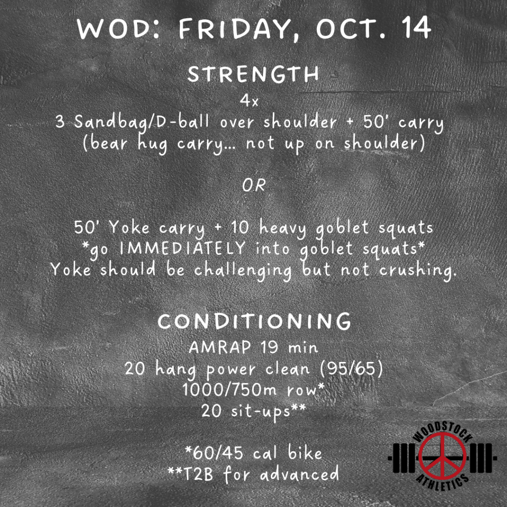 Friday’s Strength piece looks a little different… You’re going to have the option to do some sandbag to shoulder + a sandbag carry OR a yoke walk + goblet squats. You can choose to do 4 of the same thing, or you can do some of both. Either way, the idea is to go immediately from the first part to the second. So if you’re doing the sandbag, you’ll do 3 sandbag over shoulder as fast as possible, and then immediately pick the sandbag back up and carry it the length of the gym. For the yoke, you’ll run the yoke the length of the gym (you can feel free to load it up as you see fit), and then you’ll immediately grab your heavy KB and do 10 goblet squats. Both of these complexes will be taxing muscularly and cardiovascularly. Be prepared. 😃