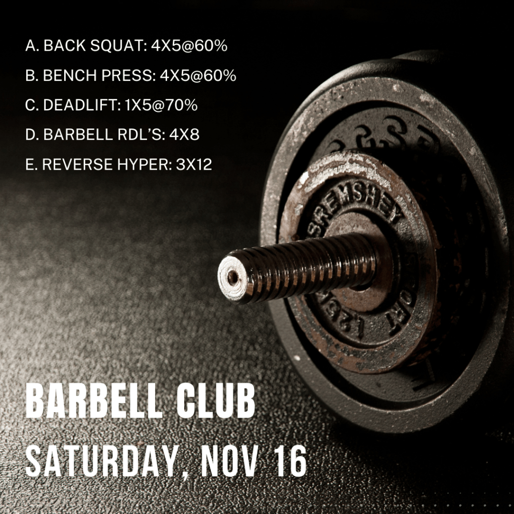 Barbell Club today is light day for squat and bench, and we are doing Pendlay rows instead of deadlifts. *For deadlifts, we will only have light and heavy days each week.*