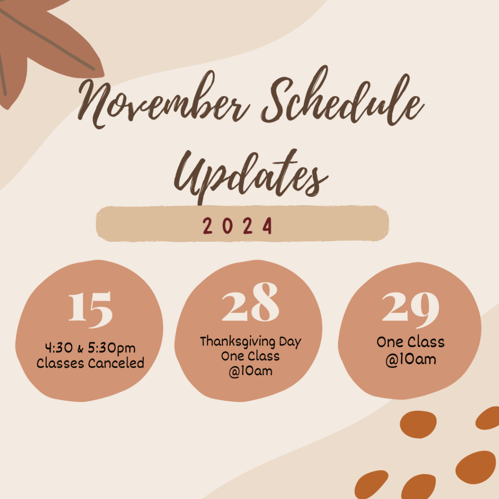 This Friday, November 15, the 4:30 & 5:30pm classes will be canceled.