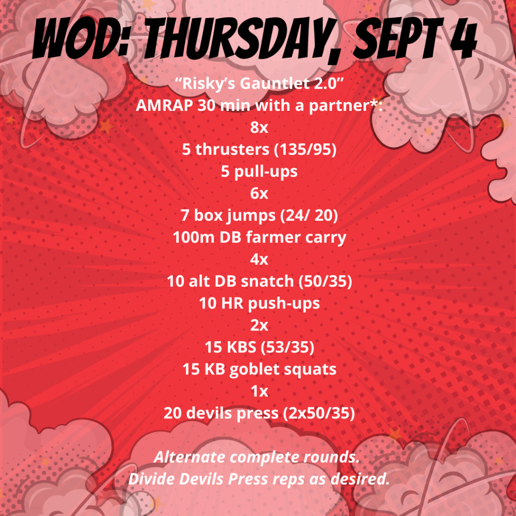 We will be doing an AMRAP version of “Risky’s Gauntlet,” the WOD we did for her fundraiser in June.